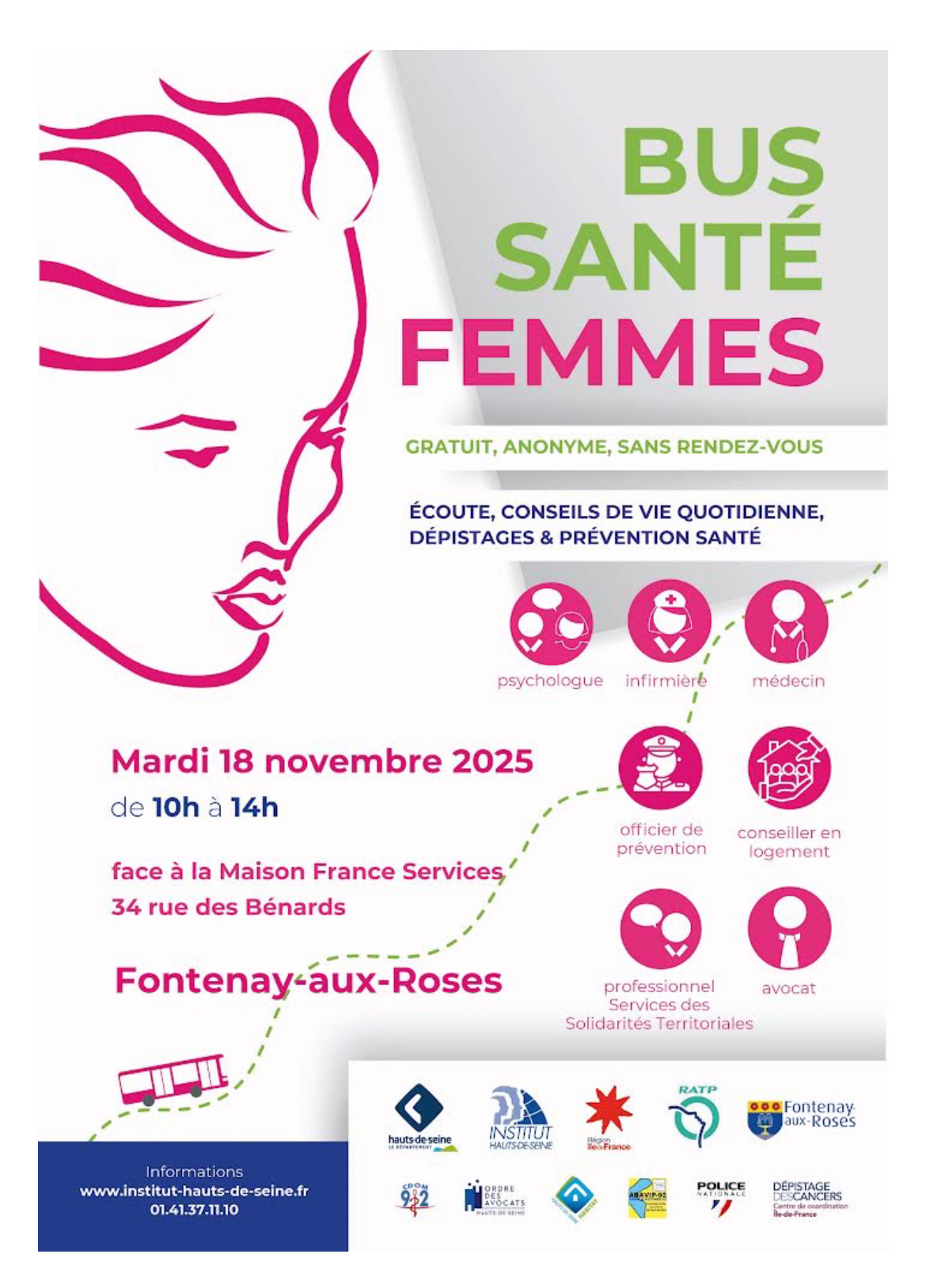 Le Bus Santé Femmes est un dispositif itinérant gratuit, anonyme et sans rendez-vous, créé en 2019 par Institut des Hauts‑de‑Seine et le Conseil départemental des Hauts‑de‑Seine, qui circule dans les départements des Hauts-de-Seine et des Yvelines.