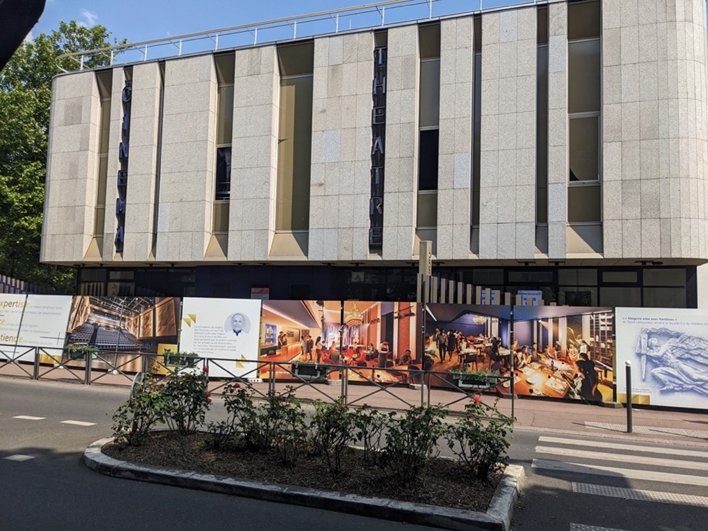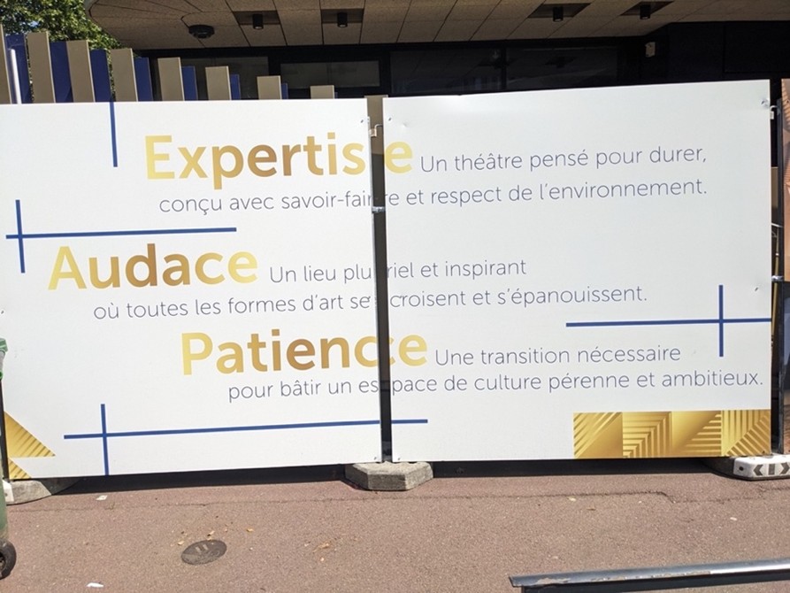 Nous avons tous vu apparaître il y a quelques mois des palissades devant le théâtre, en vue des travaux qui sont censés s’y dérouler. Je vous propose un petit décryptage personnel des visuels de communication qui y ont été mis en place.
