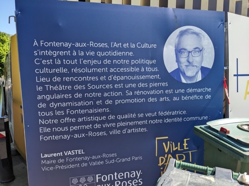 Premier temps, sur le panneau signé Laurent Vastel on peut lire derrière les poubelles : « politique culturelle résolument accessible à tous » ; un peu plus bas : « promotion des arts au bénéfice de tous les fontenaisiens », : et enfin « une offre artistique de qualité qui se veut fédératrice. » Le message est on ne peut plus explicite : le théâtre sera largement ouvert à toute la population de la ville. C’est le maire qui le dit et le répète. Super.