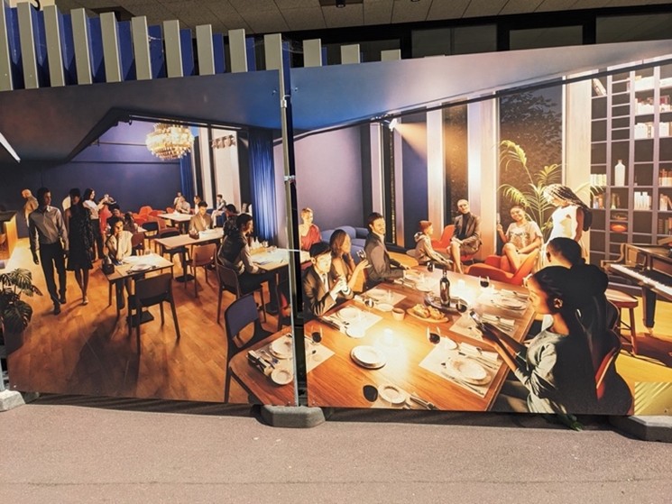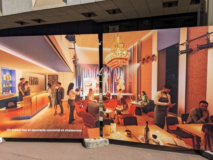 Mais voici le second temps : au centre du dispositif, se trouvent quatre panneaux de deux mètres par deux, de loin les plus visibles, qui, en deux images, montrent, de manière un peu idéalisée, à quoi ressemblera le foyer du théâtre, qui restera à l’étage (donc toujours aussi peu accessible que par le passé) : « un espace bar et spectacle convivial et chaleureux ». Regardons ces deux images de près. On constate d’abord que pour l’essentiel, le bar ne changera pas : les seules modifications sont le comptoir, le mobilier et le sol. Ça sera sobre et moche, vaguement cosy. Mais l’essentiel me semble être ailleurs : dans les personnes représentées. On nous montre en effet exclusivement des jeunes femmes élégantes, en robe ou en jupes, avec des chaussures à talons, les jambes croisées, le dos bien droit, les cheveux longs et bien coiffées, et des jeunes hommes en veste ou en chemise bien repassée, avec pull sur les épaules, impeccablement coiffés eux aussi, le tout sur fond de concert de jazz intimiste. Le personnel porte des tabliers comme dans les bars à vin.
