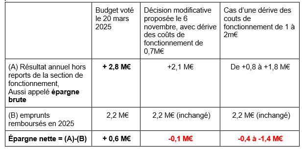 De plus, un indicateur tel que l’épargne nette de la ville, qui sert aux banques à décider si elles peuvent continuer à prêter à une collectivité, et à quels taux, risque de basculer. Le budget prévoyait une épargne nette à 0,6M€, légèrement positive. Si le déficit provient d’une dérive de couts de fonctionnement, cet indicateur sera nettement négatif pour 2025 (**).