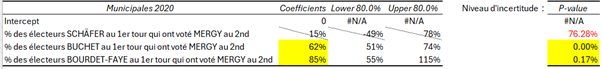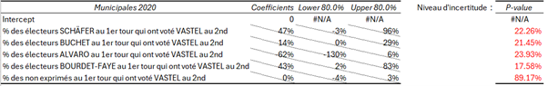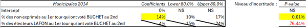 Pour le second facteur, le niveau d’incertitude (p-value en rouge) est trop élevé. Si des voix de 1er tour de D. LAFON sont revenues au maire sortant, elles étaient peu nombreuses et/ou peu représentatives.