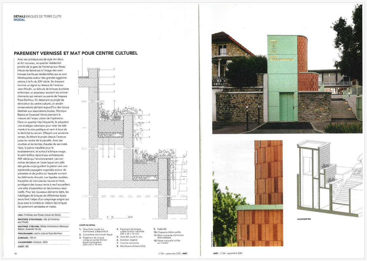 Dans son numéro n°334 de septembre 2025, elle consacre un dossier sur les détails de briques en terre cuite en présentant 5 réalisations dont celle qui habille une partie du petit édicule de l’accès PMR au parvis de la salle Rosa Bonheur.