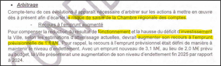 Les fonctionnaires, comme c’est leur travail, proposent une solution au maire : face à ces dérives, la ville doit emprunter 1,1M€ :