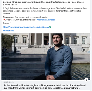 Il s’agit d’observer une minute de silence en hommage à son frère Mehdi, victime innocente d’un assassinat à Marseille pour faire taire Amine et tous ceux qui dénoncent le narcotrafic et sa violence. »