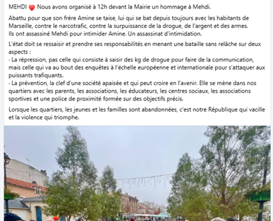 Et le lendemain : « MEHDINous avons organisé à 12h devant la Mairie un hommage à Mehdi. Abattu pour que son frère Amine se taise […] »