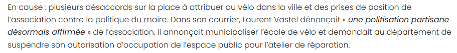 Second exemple : l’association FARàVélo, militant, comme son nom l’indique, pour la pratique de la bicyclette. Dans son programme électoral de 2020, Laurent Vastel s’engage à mettre en œuvre le plan vélo élaboré par cette association. Réélu, le maire oublie cette promesse. L’association a-t-elle l’outrecuidance de s’insurger ? On lui supprime le local mis à disposition par la mairie et on municipalise l’école de vélo…