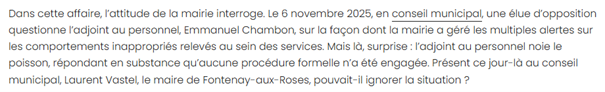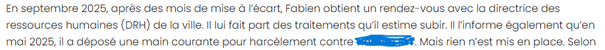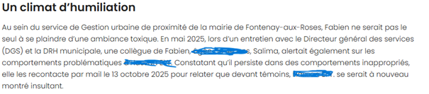 Dans sa première partie, l’article rappelle la condamnation, il y a 10 ans, d’un ancien maire pour harcèlement moral, et dénonce des pratiques managériales récentes plus que douteuses, certainement sanctionnables juridiquement, sans que ni les hiérarchies, ni les élus de la majorité municipales se semblent s’en offusquer. Qu’on en juge (je reproduis ci-dessous des extraits de l’article en masquant les noms qui ne sont pas des pseudonymes) :