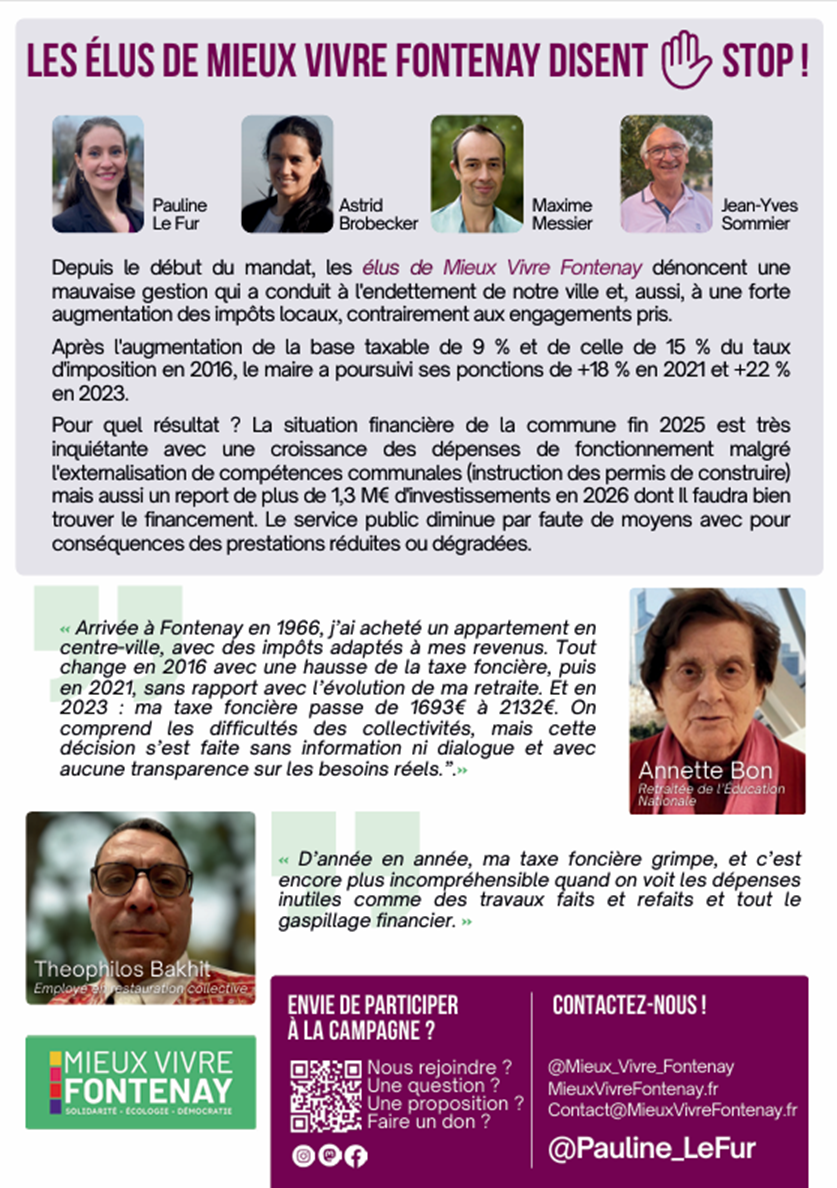 Plus de 70% d’augmentation de la taxe foncière en 10 ans à Fontenay ! – Mieux Vivre Fontenay 18 janvier 2026 Moussa Koné-Dialloet le collectif Mieux Vivre Fontenay Partager :PartagerFacebook Plus de 70% d’augmentation de la taxe foncière en 10 ans à Fontenay ! – Mieux Vivre Fontenay Reviewed by Blog Osez Fontenay on 18 janvier 2026 . Moussa Koné-Dialloet le collectif Mieux Vivre Fontenay Partager :PartagerFacebook Moussa Koné-Dialloet le collectif Mieux Vivre Fontenay Partager :PartagerFacebook Rating: 0