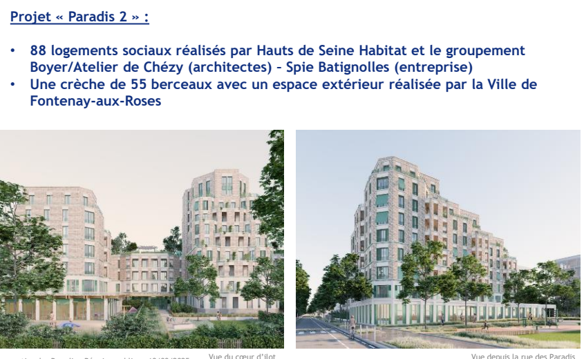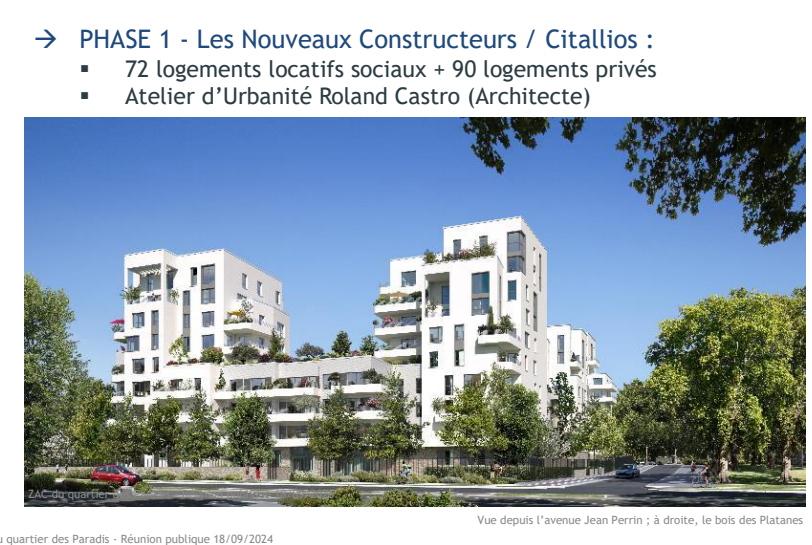 Le phasage suivant concerne l’aménagement des espaces publics du « mail Verlaine » et « le bois des platanes » dont les travaux sont prévus fin 2025/ 2026. La construction de l’immeuble Paradis 2 doit démarrer (88 logements sociaux) avec la crèche qui ne comprendra plus que 55 berceaux selon le diaporama (et non 60 comme annoncés), ce qui ne compensera pas la perte enregistrée ces dernières années pour l’accueil des plus petits. La présentation n’en a pas précisé le calendrier.